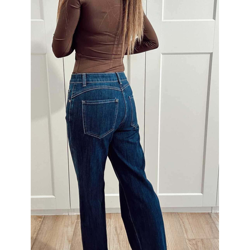 - Pantalón vaquero de tiro alto con pernera ancha y recta.