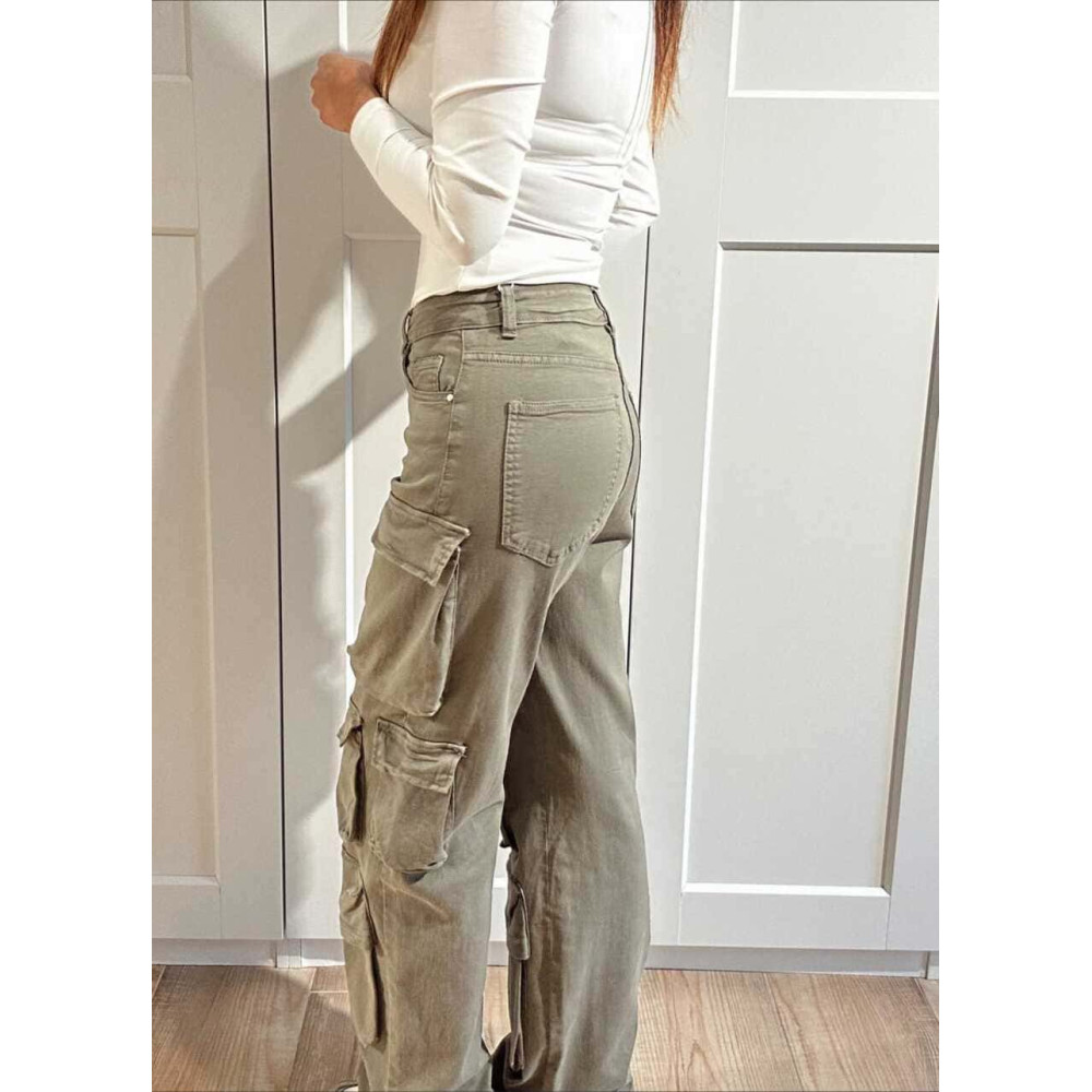- Pantalón vaquero de estilo cargo con tiro alto y pernera recta.