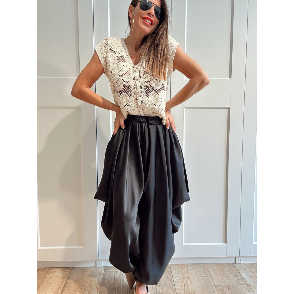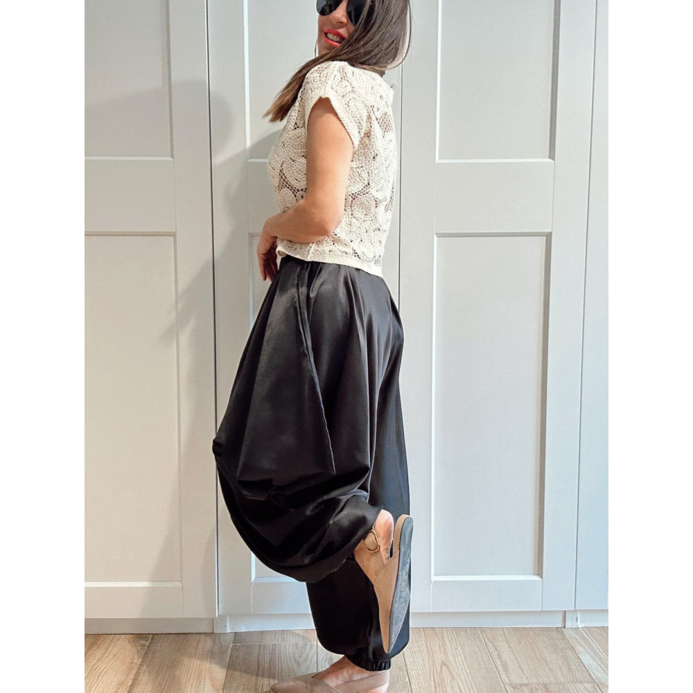 - Pantalón estilo harem con caída suave y maxi volumen.