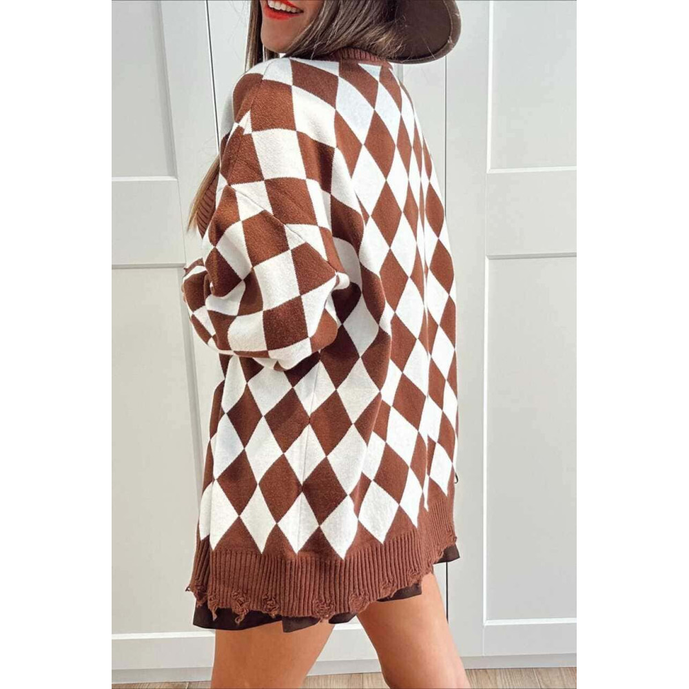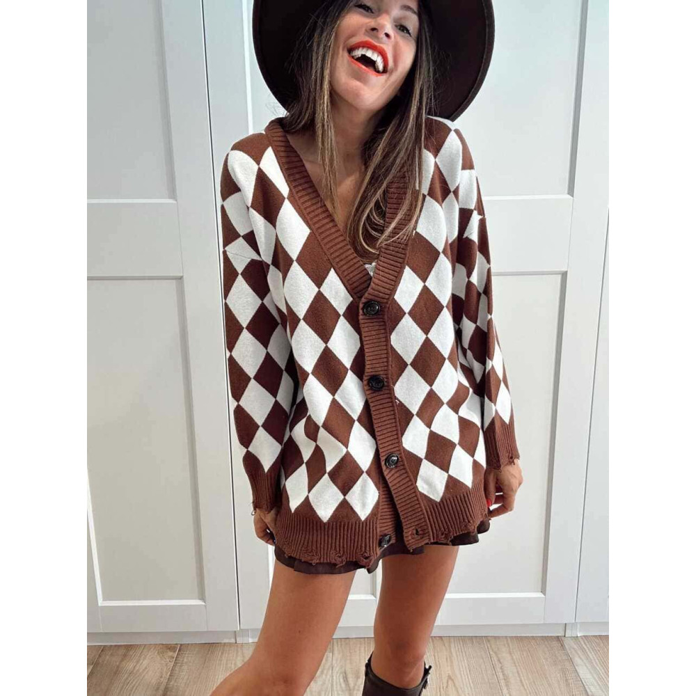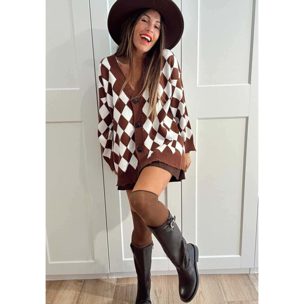 - Chaqueta de punto interlock con estampado de rombos en combinación marrón/beige.