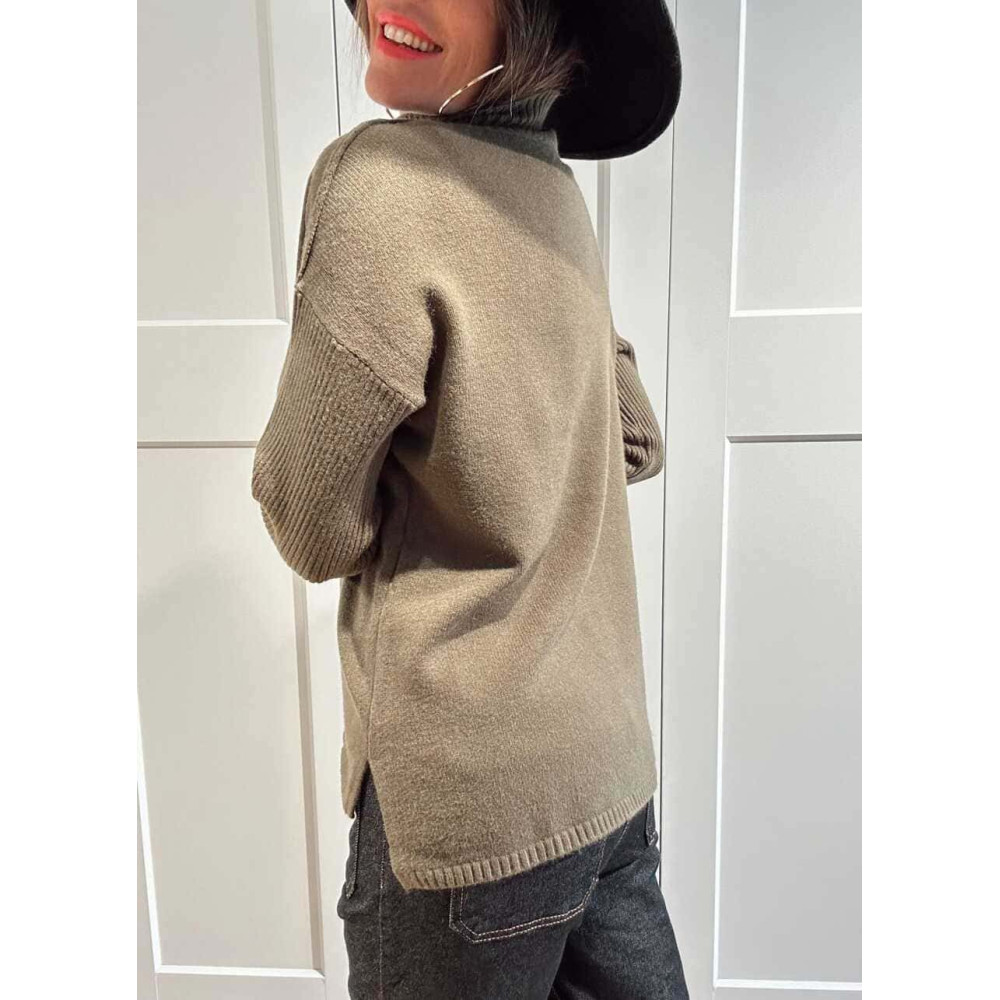 - Jersey de punto soft con cuello chimenea y manga larga acanalada.