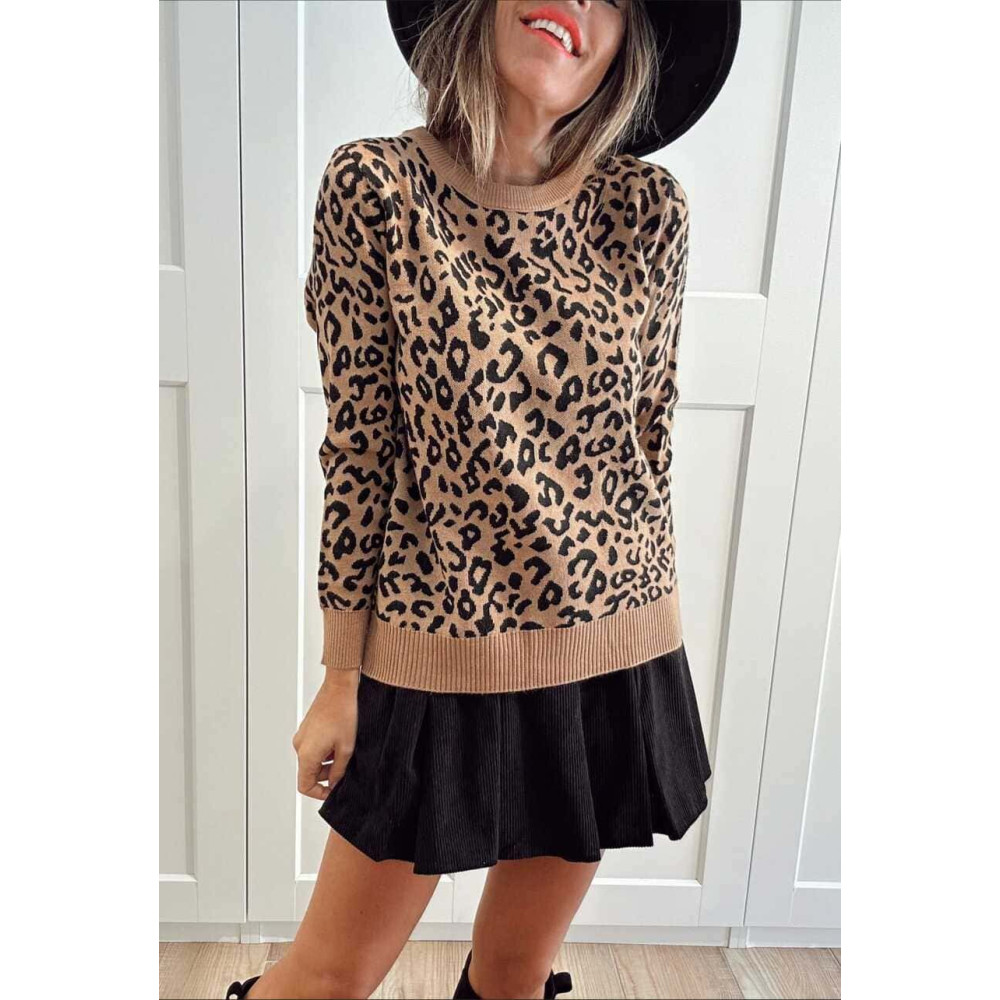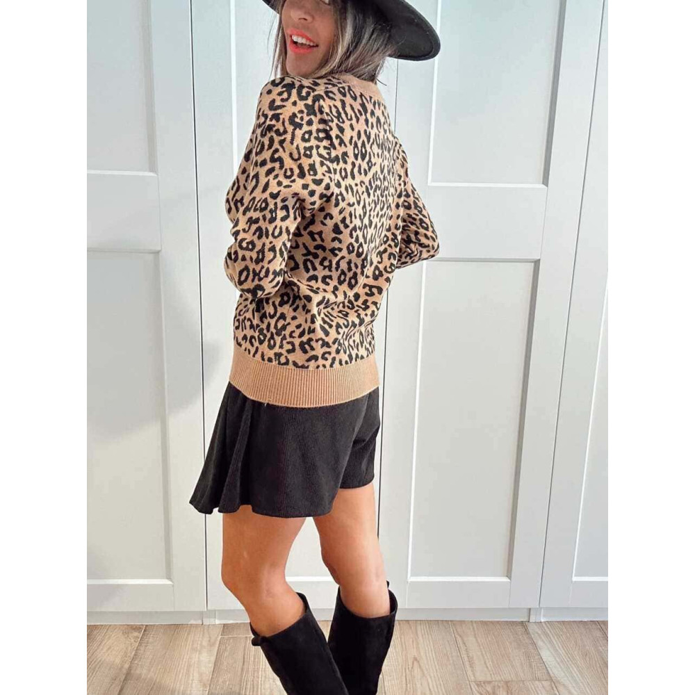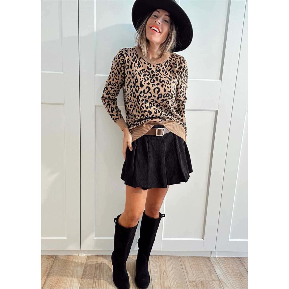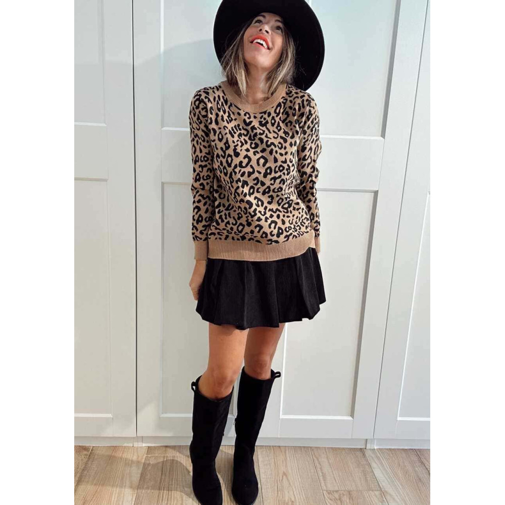 - Jersey de punto con estampado animal print en tonos camel y negro.