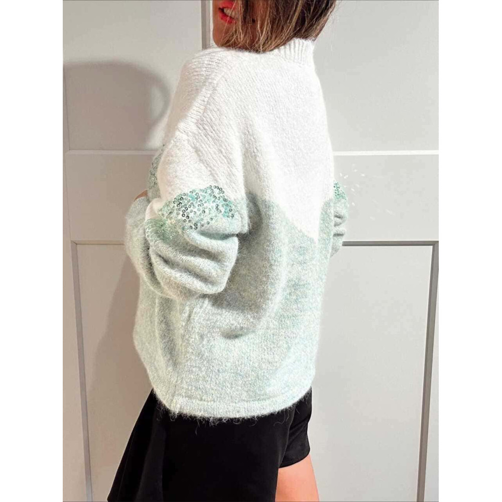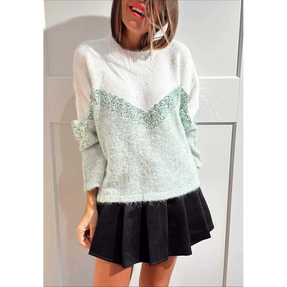 - Jersey de punto soft en tonos blanco roto y verde con diseño chevron en lentejuelas a tono.