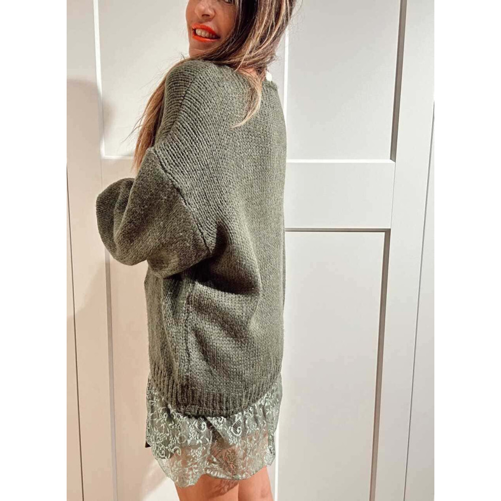- Jersey de punto grueso con puntilla de encaje festoneada en el bajo.