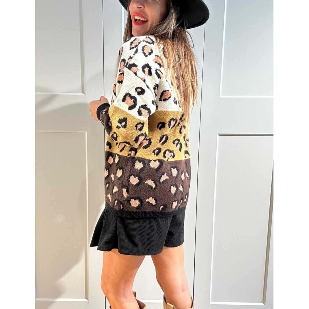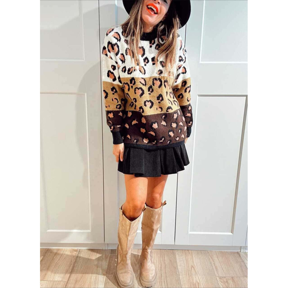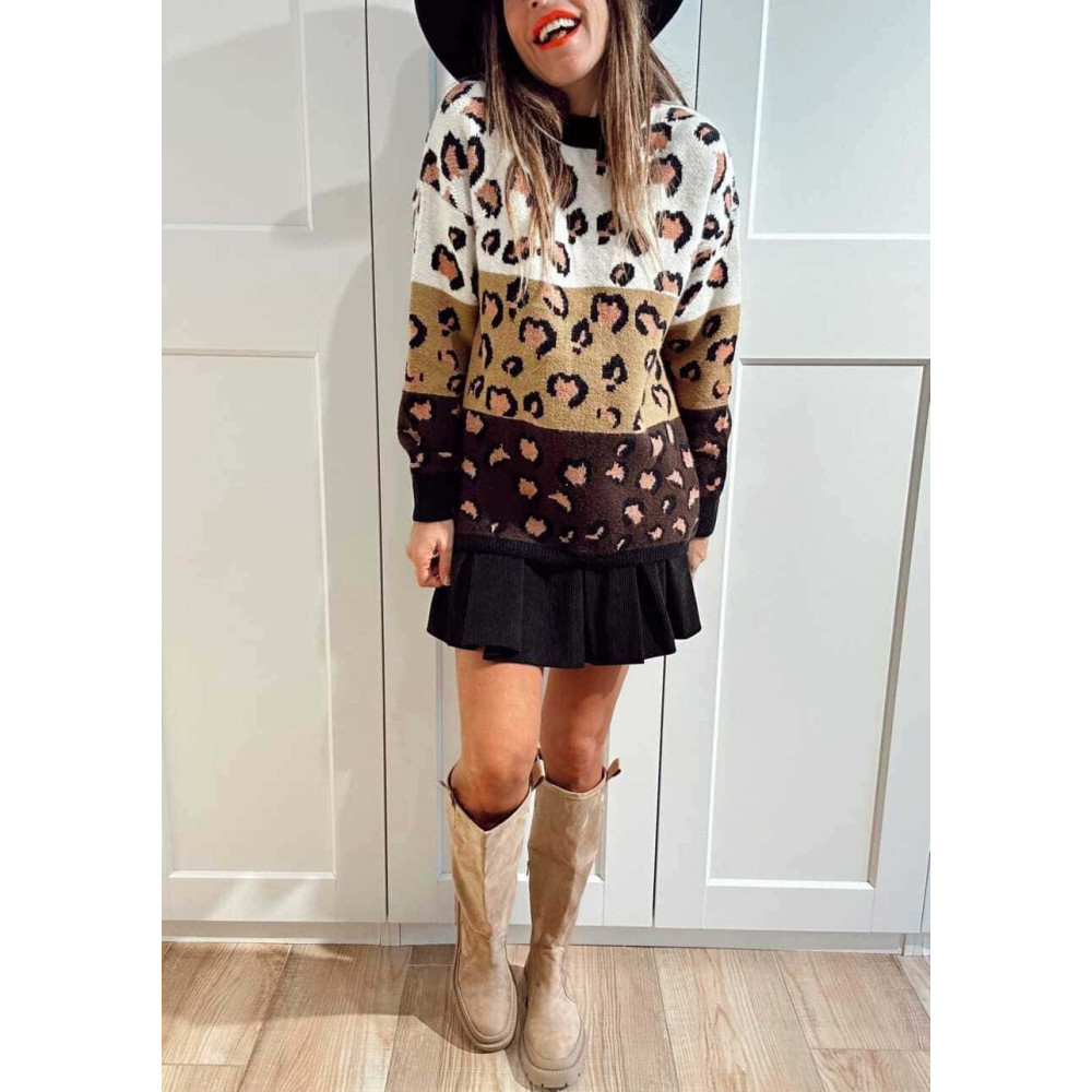 - Paneles color block y estampado animal print en tonos beige, ocre, marrón, negro y nude.
