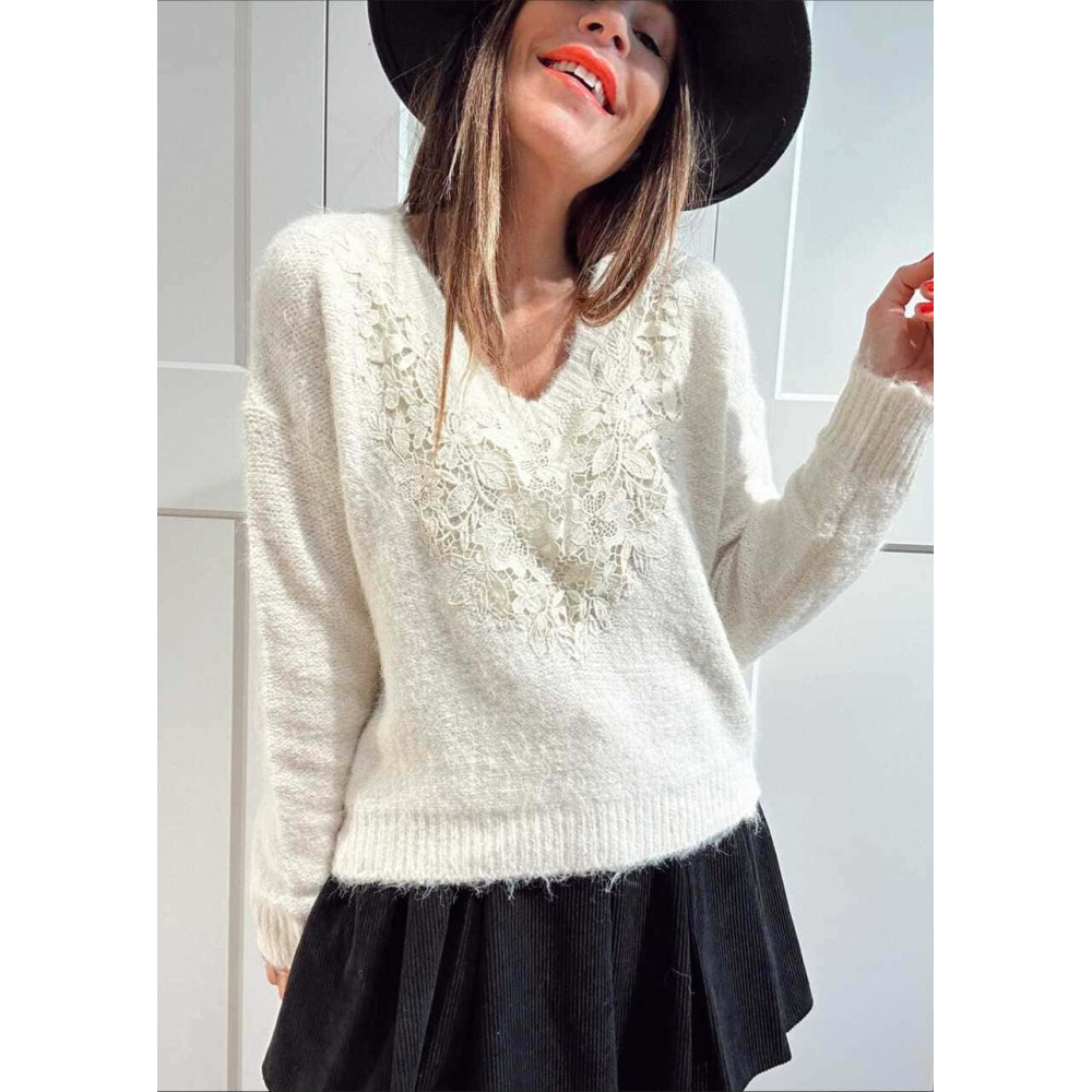 - Jersey de punto suave efecto angora con aplique de encaje bordado en la pechera.
