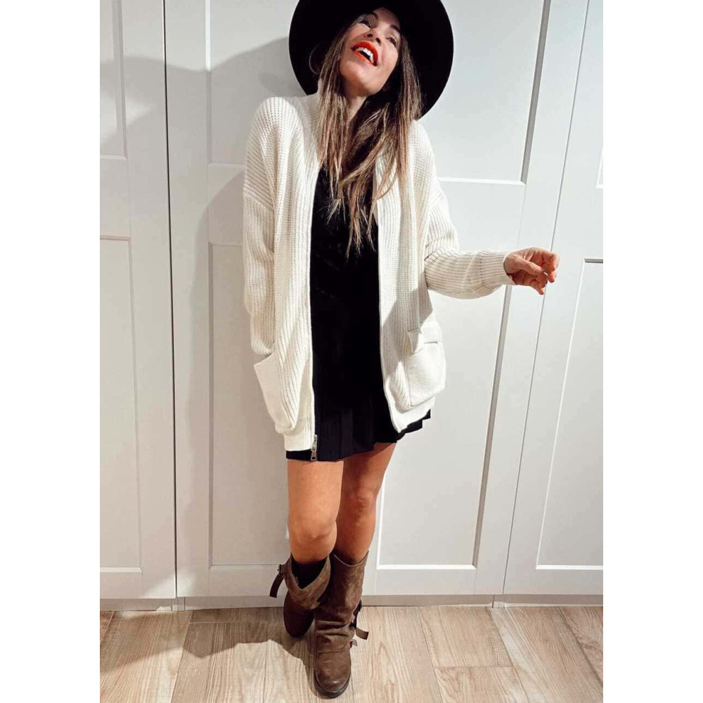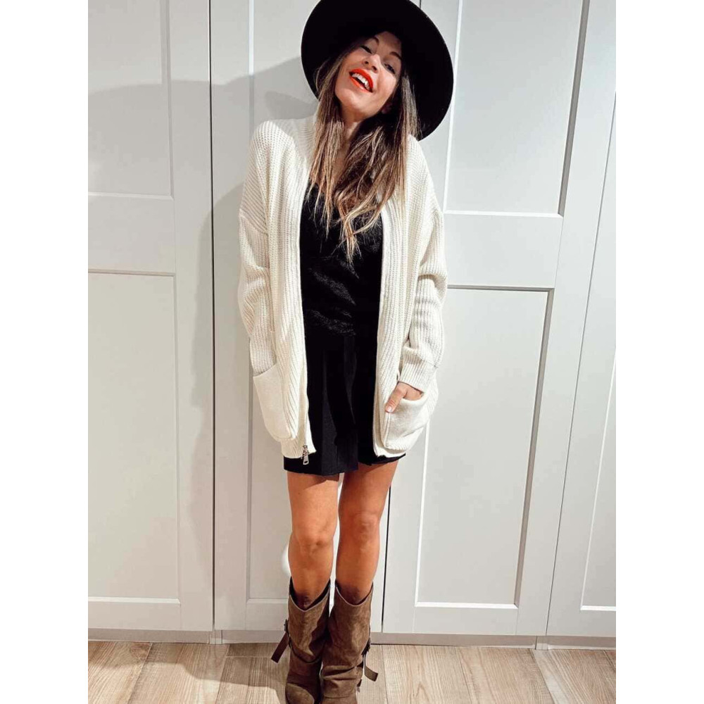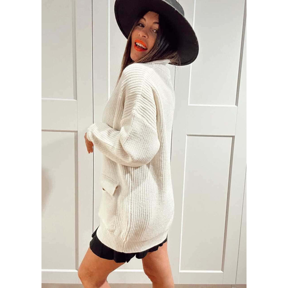 - Chaqueta larga de punto grueso con cuello subido y cierre de cremallera con doble cursor.