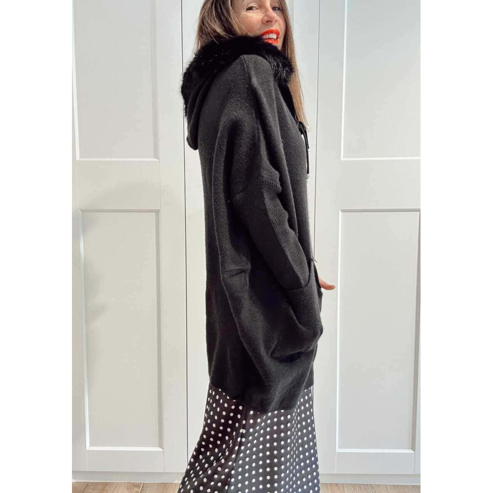 - Capucha fija con aplique de pelo sintético desmontable mediante botones invisibles.