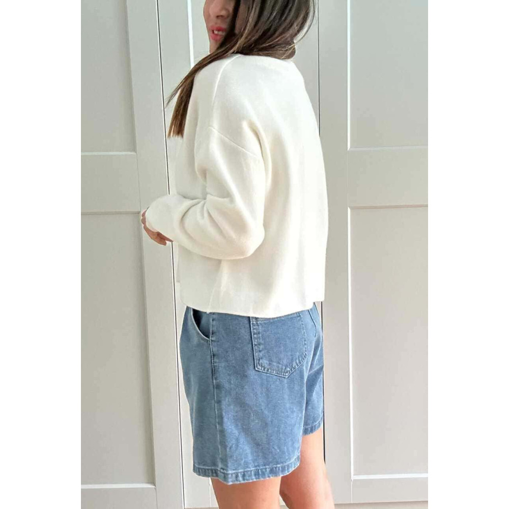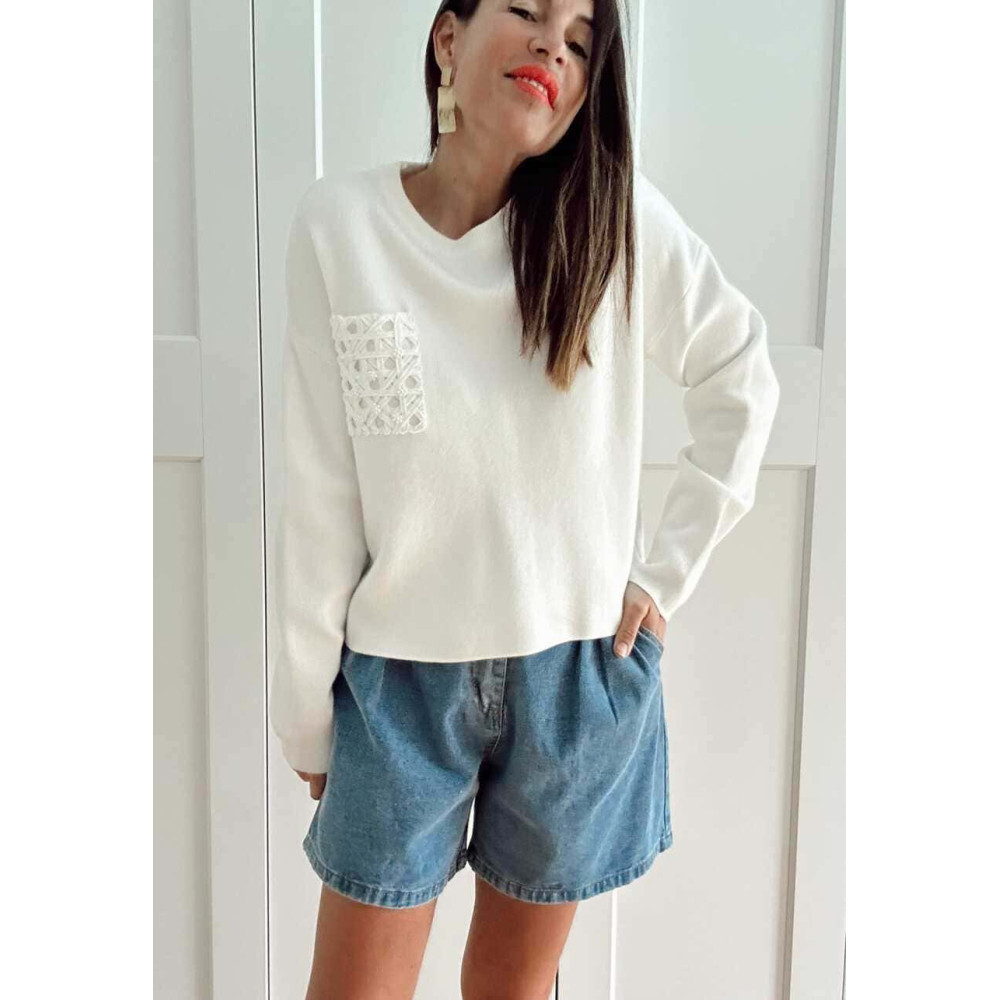- Jersey de punto soft con detalle de bolsillo calado con abalorios en la pechera.