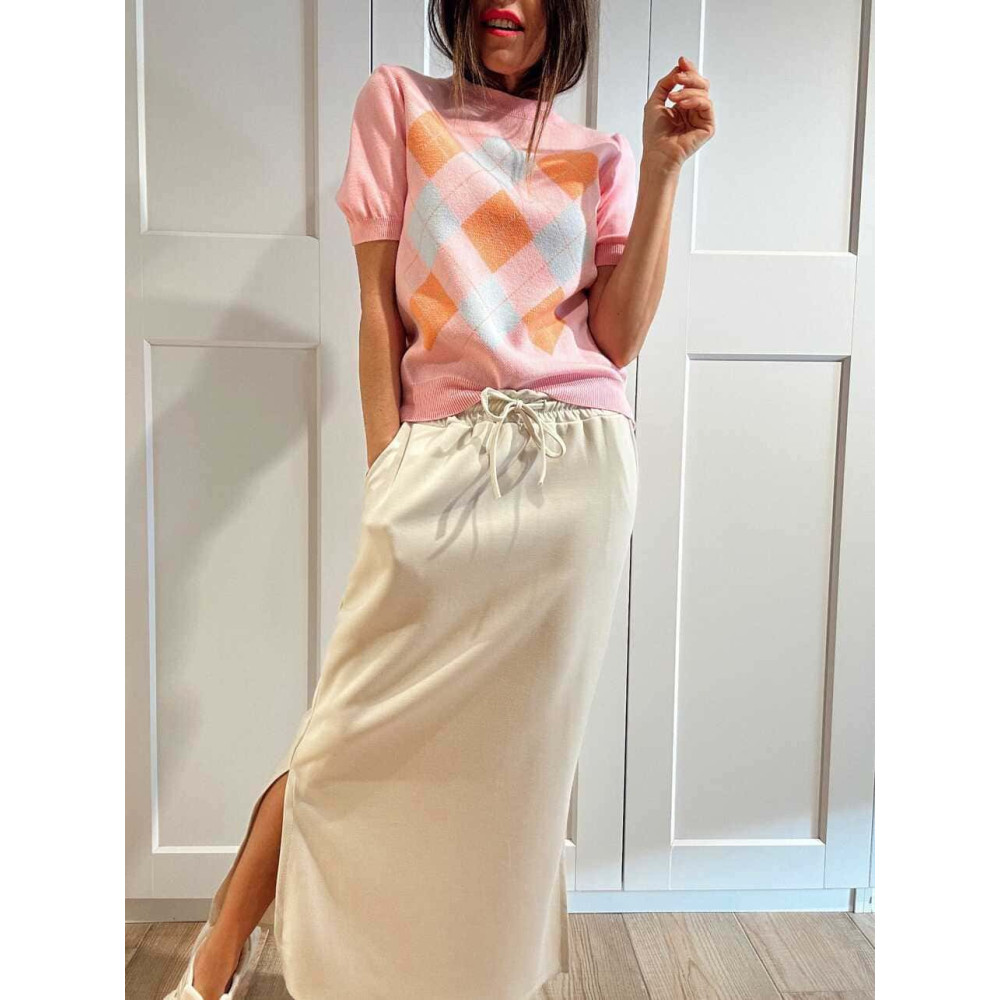 - Jersey de punto fino con estampado rombos en tonos rosa, salmón y azul celeste.