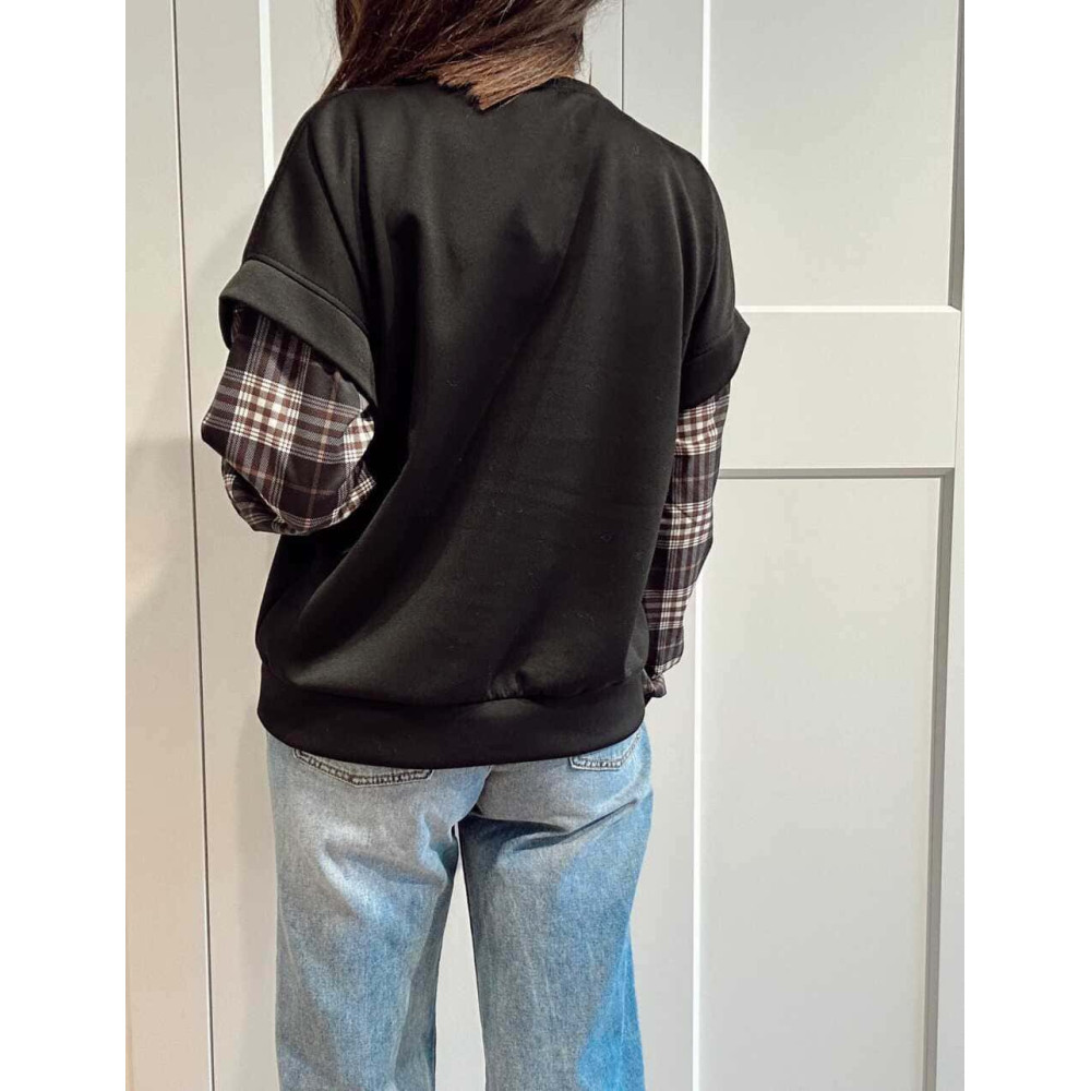 - Manga larga combinada con estampado cuadros (negro, marrón y blanco roto) y efecto sobrepuesto.