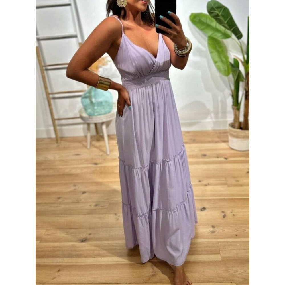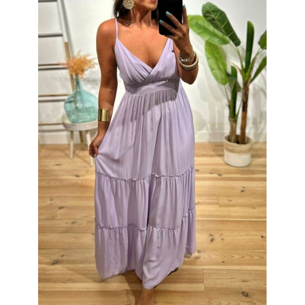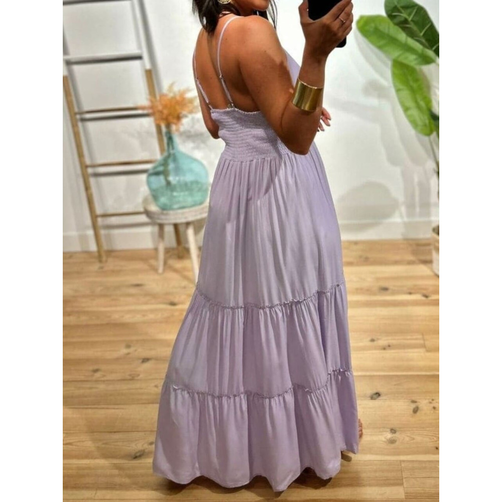 - Vestido largo con tirante fino regulable y paneles avolantados en la falda.