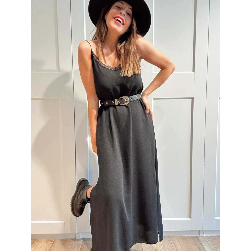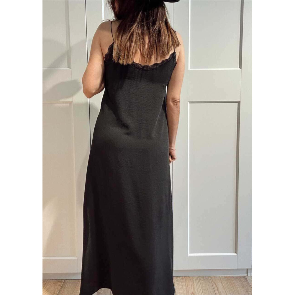 - Vestido largo de estilo lencero con puntilla de encaje en el escote.