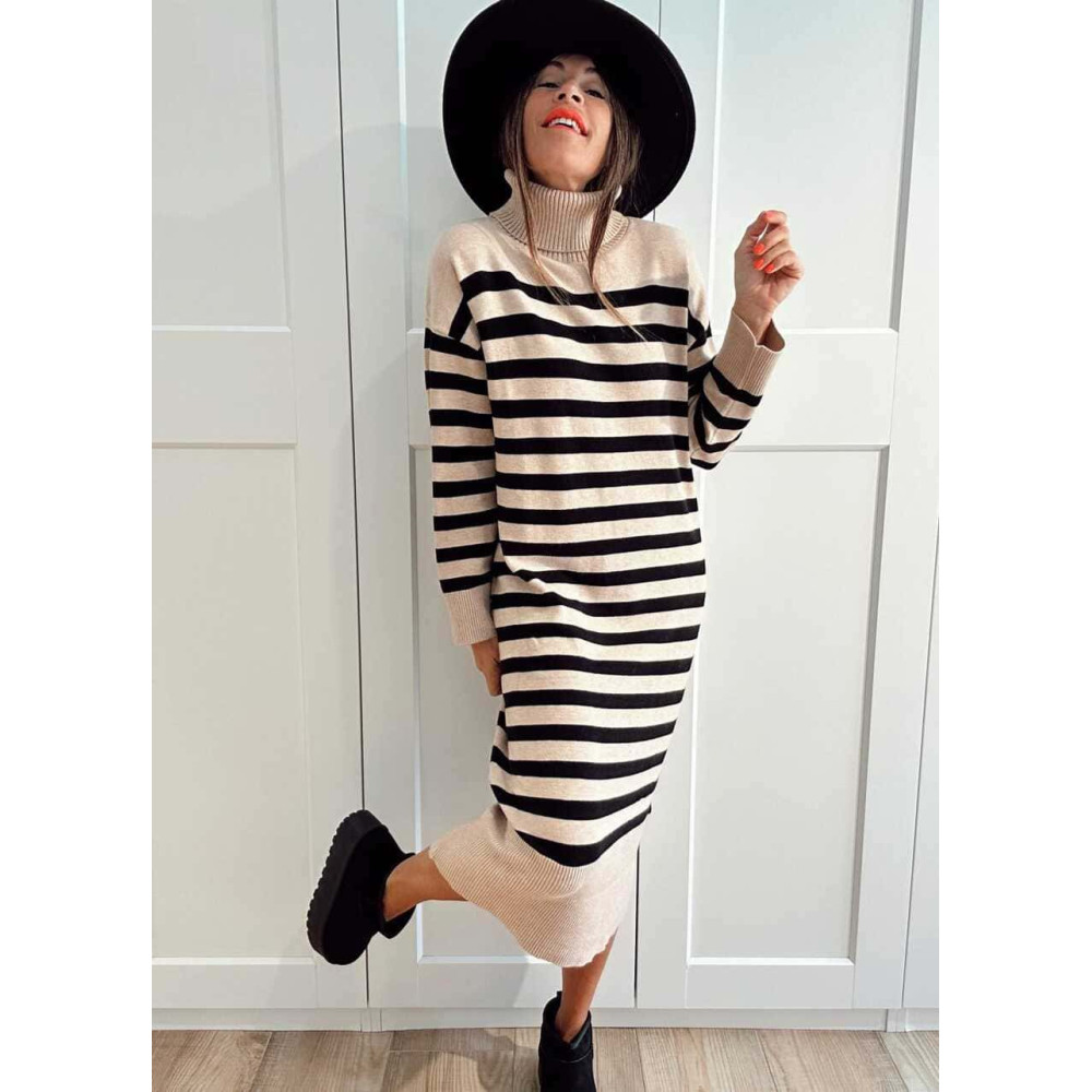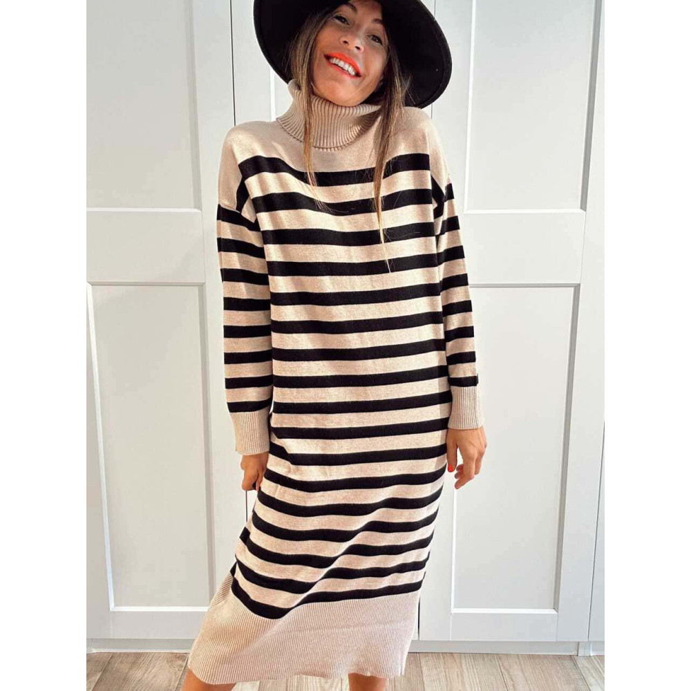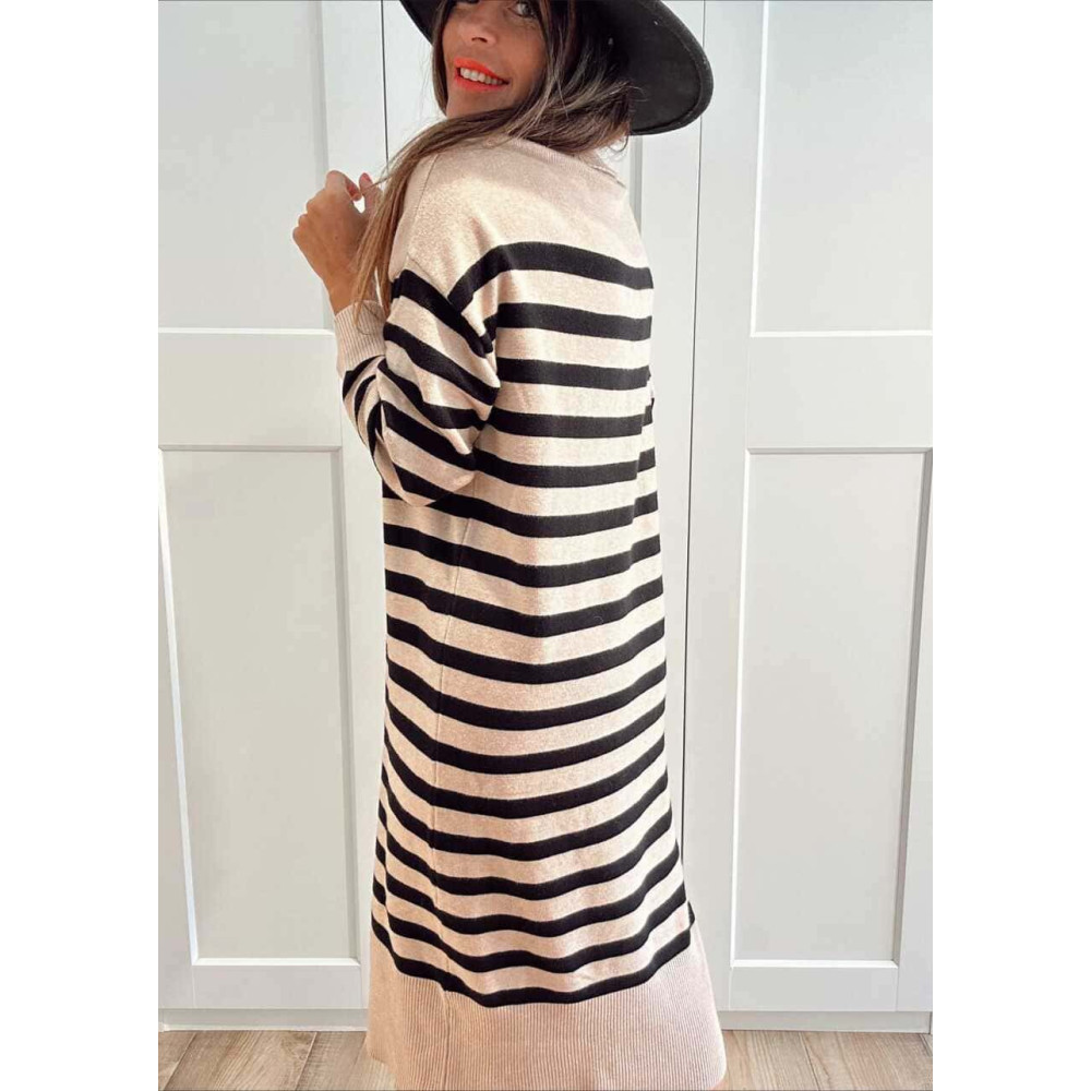 - Vestido de punto con estampado rayas en combinación beige/negro.