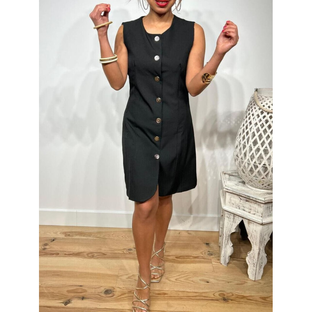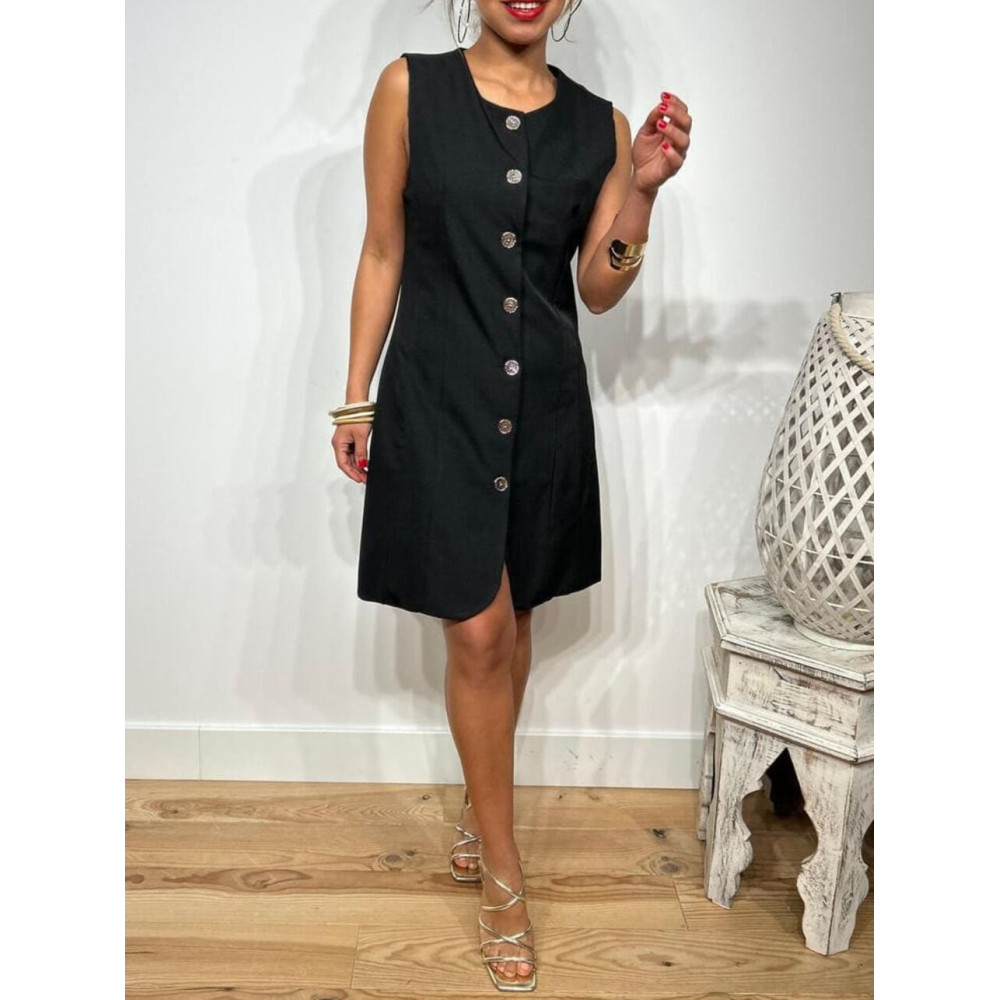 - Vestido corto tipo pichi con cuello redondo y manga sisa.