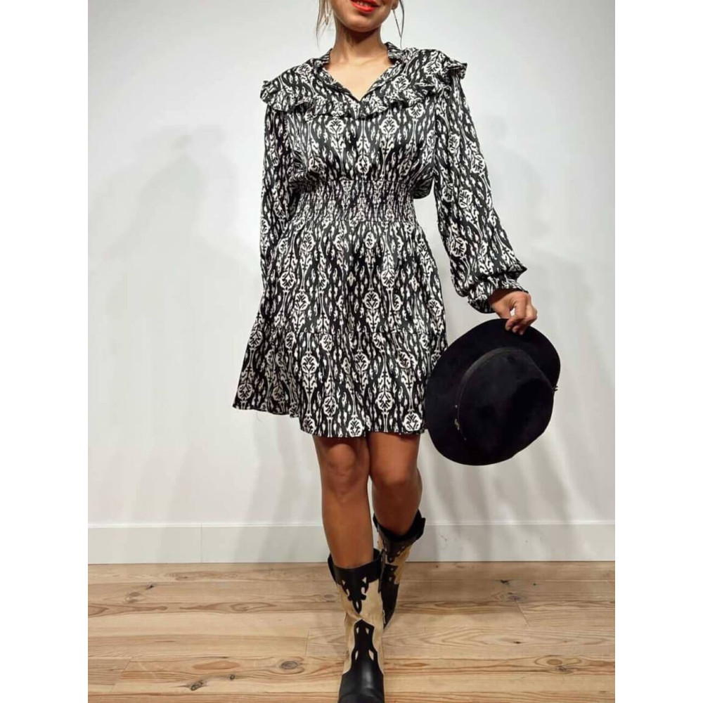 - Tela fina con acabado satinado y estampado étnico en tonos negro y beige.