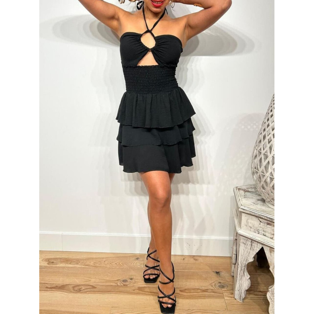 - Vestido corto de estilo corsetero con hombros descubiertos y volantes en la falda.