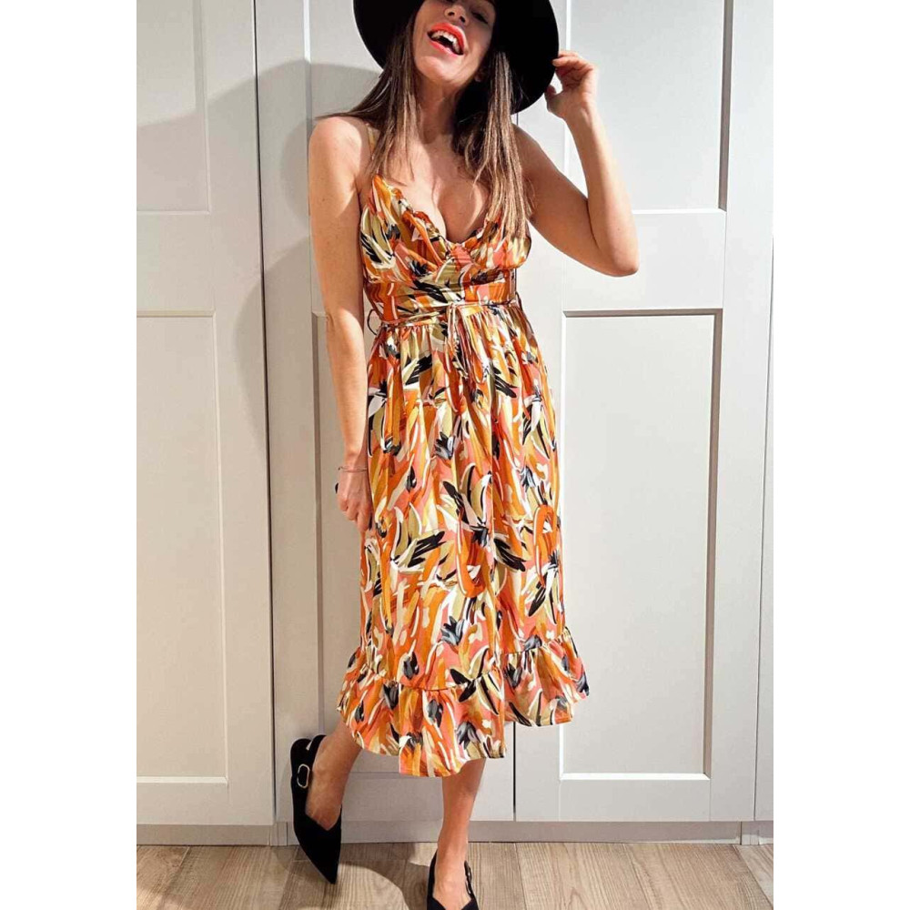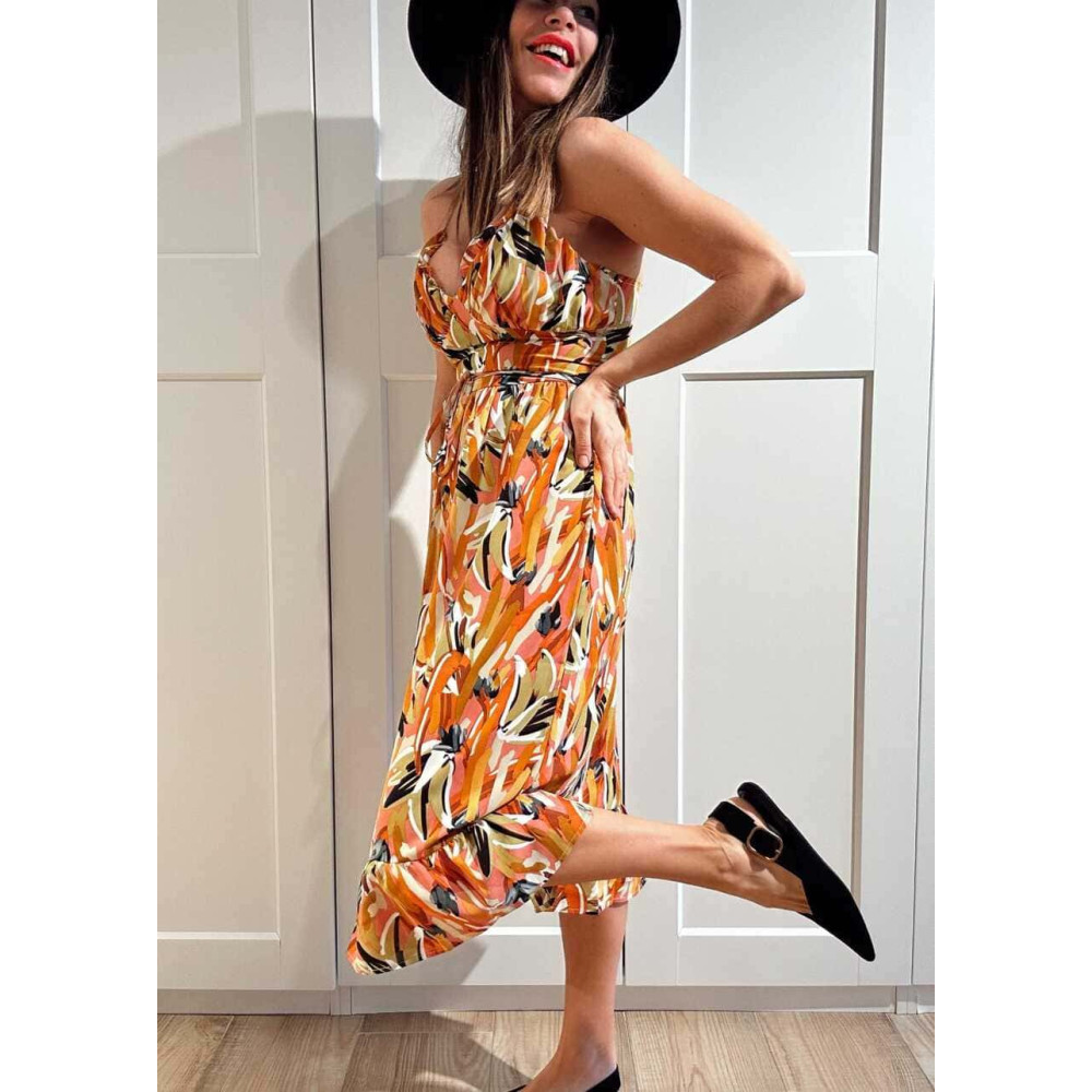 • Vestido fluido con estampado abstracto en tonos cálidos.