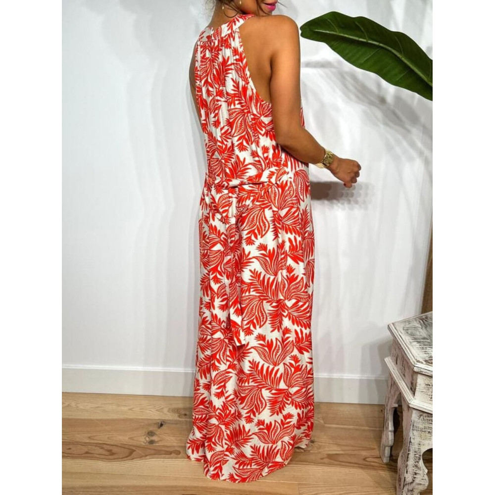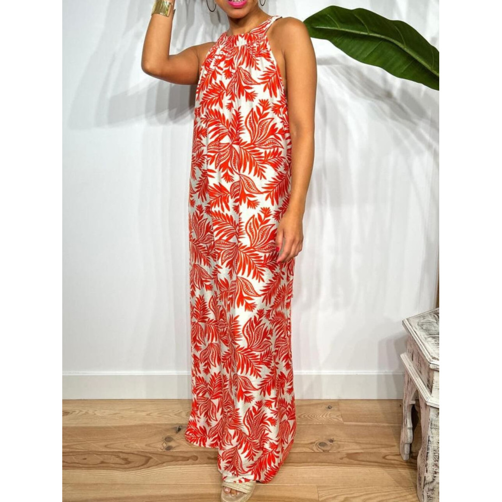 • Vestido largo de mujer con escote halter y cinturón lazada.