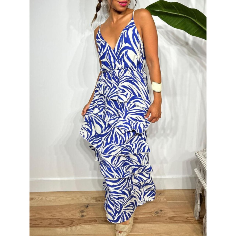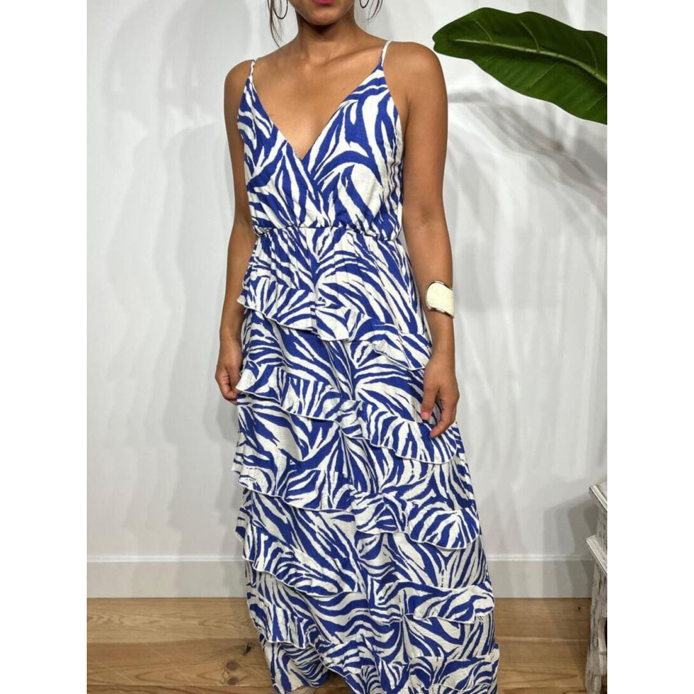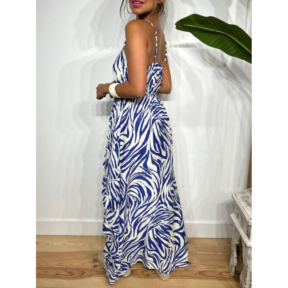 • Vestido largo con tirante fino regulable y volantes en la falda.