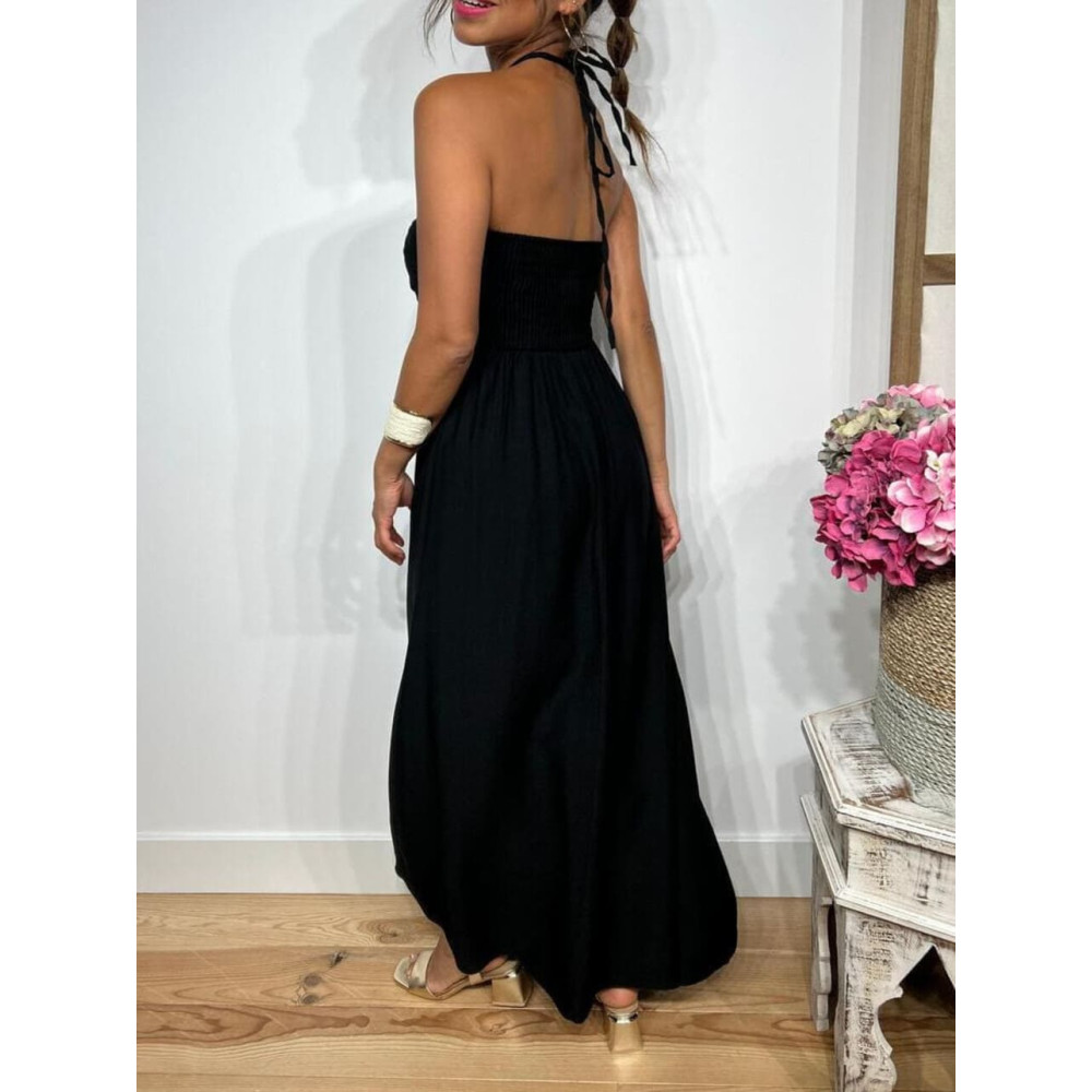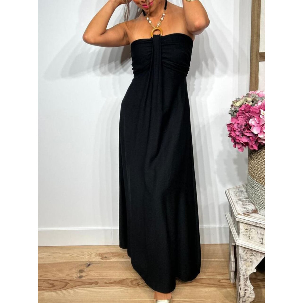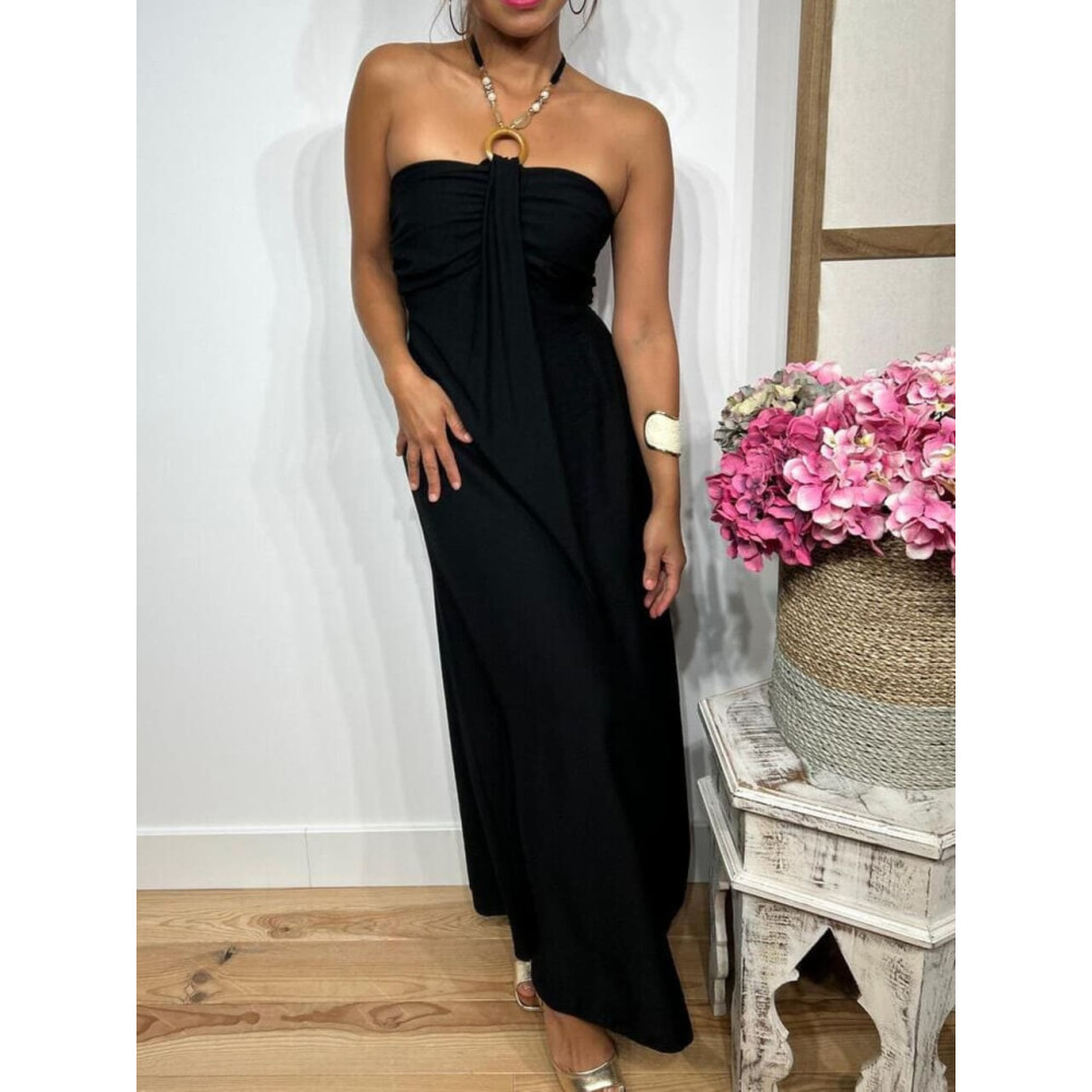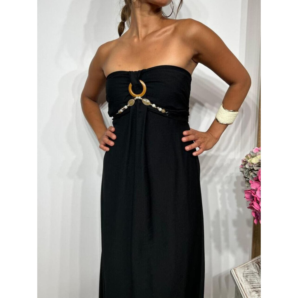 - Vestido largo con hombros descubiertos y drapeado en el pecho.