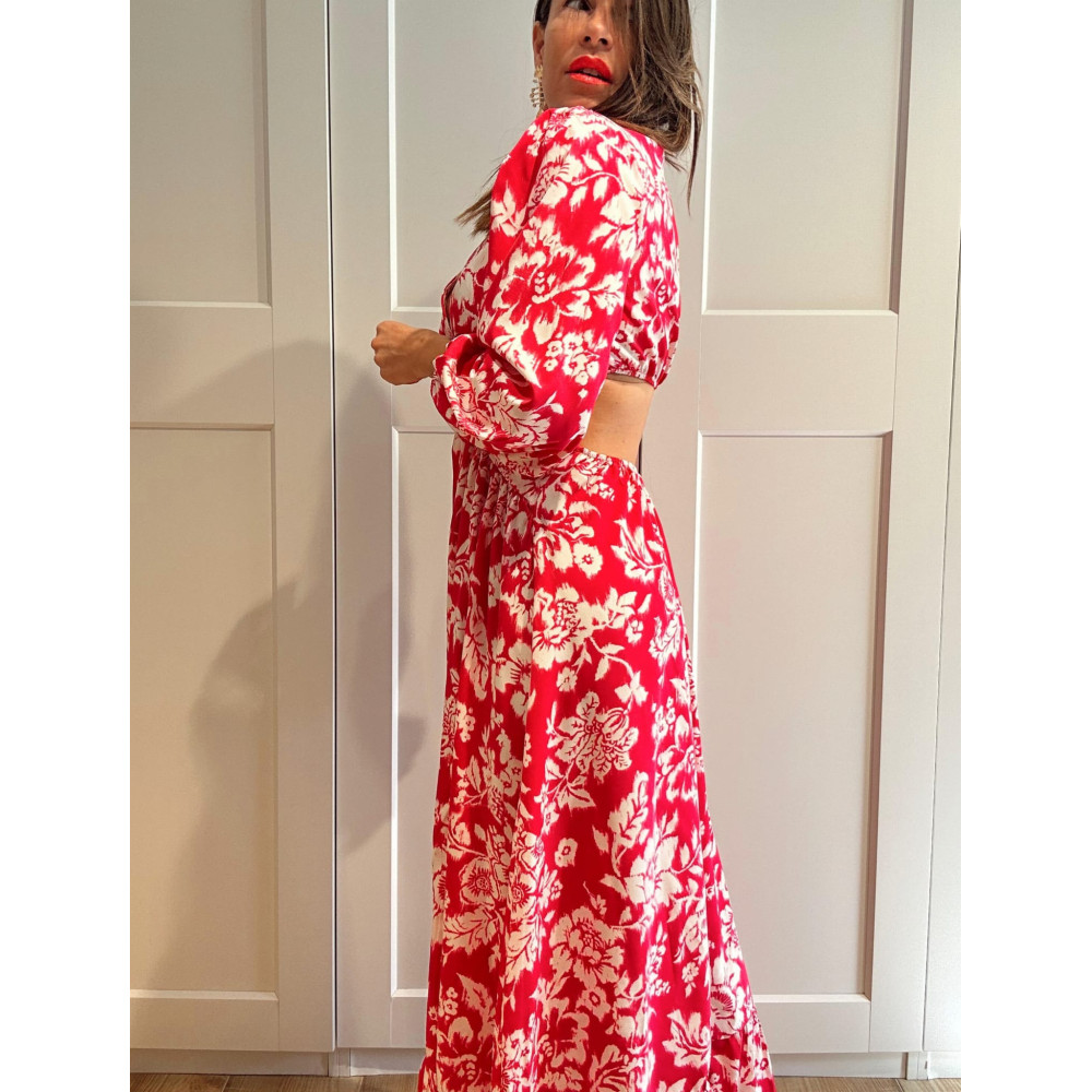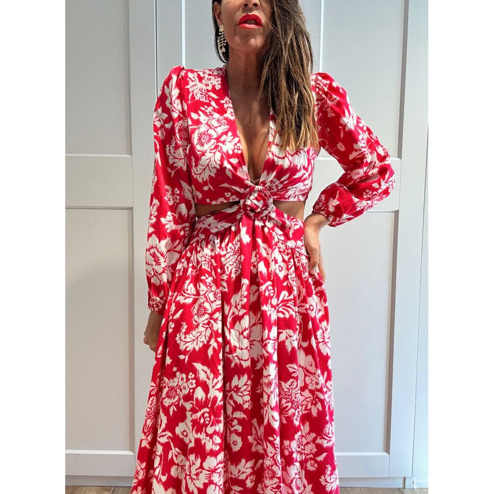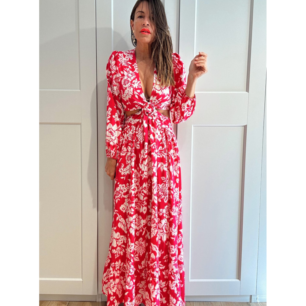 - Vestido largo efecto dos piezas con aberturas cut out y arandela forrada en la cintura.