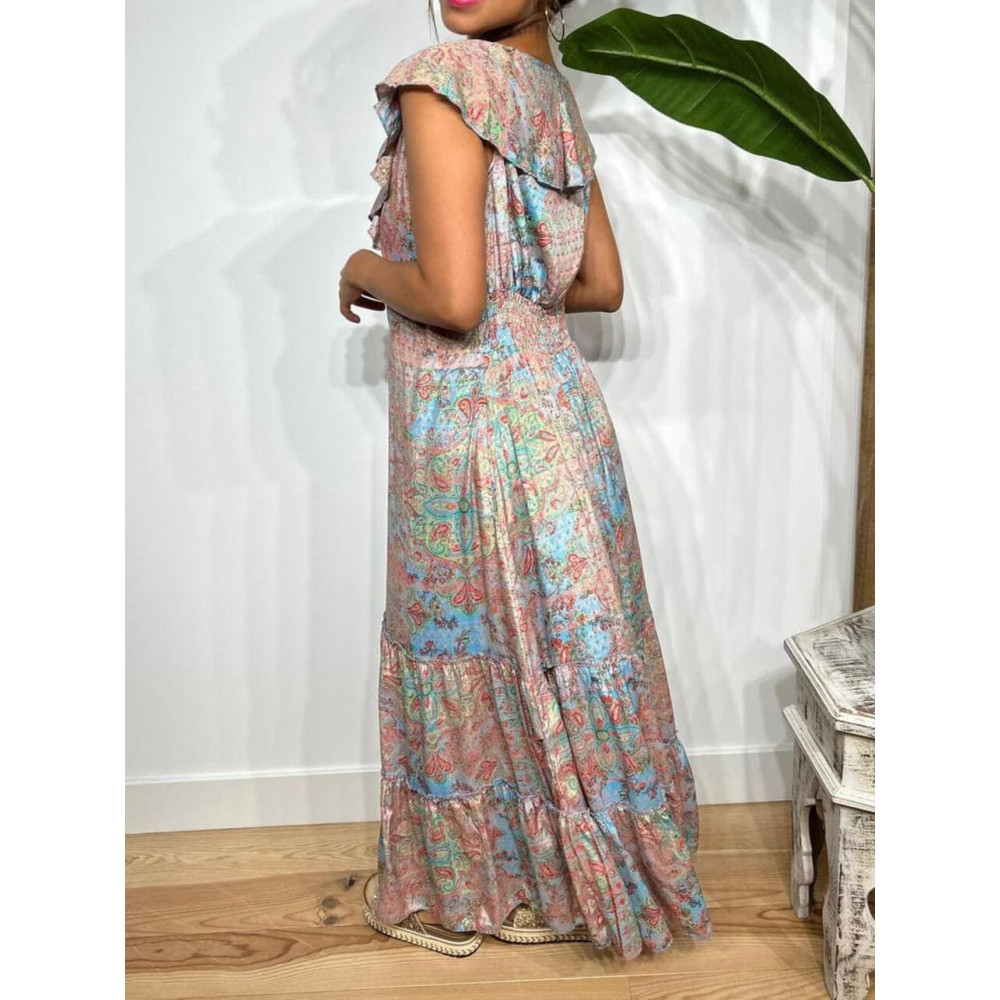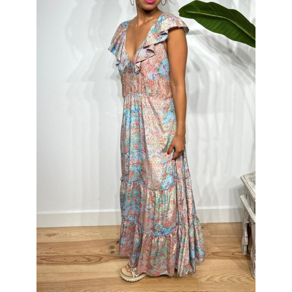 - Vestido largo con volante en el escote y espalda y paneles avolantados en la falda.
