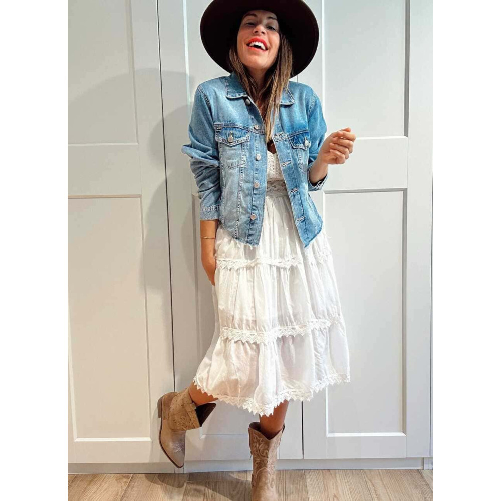 <li><strong>Vestido de estilo ibicenco con paneles avolantados y puntillas en la falda.</strong></li>