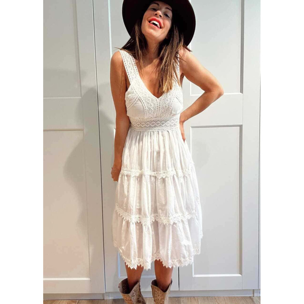 - Vestido de estilo ibicenco con paneles avolantados y puntillas en la falda.