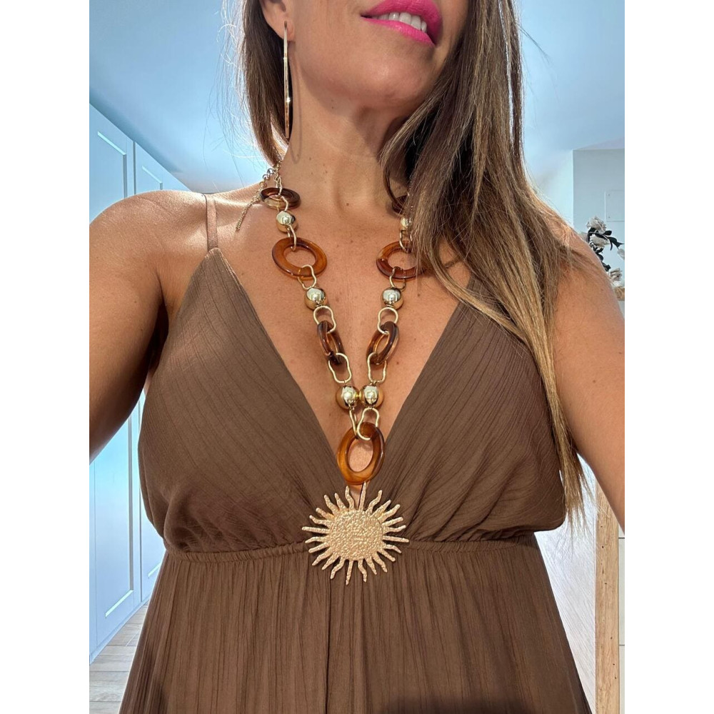 - Pronunciado escote pico con detalle de broche extraíble color oro en forma de sol ☀️
