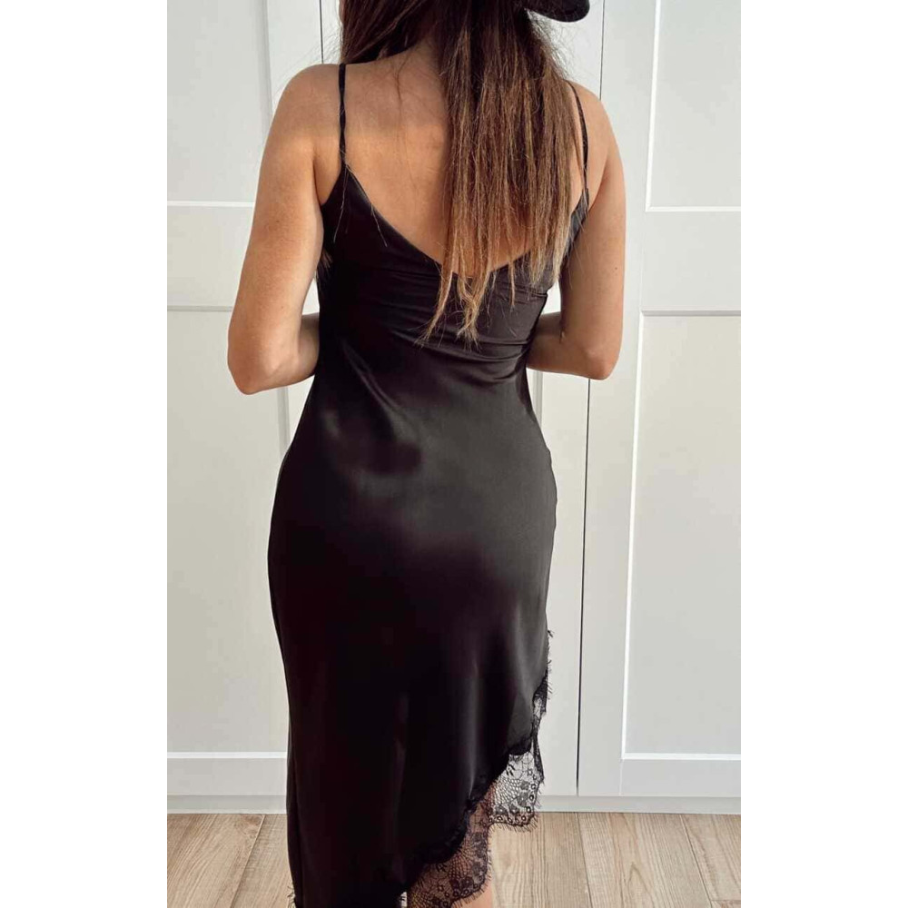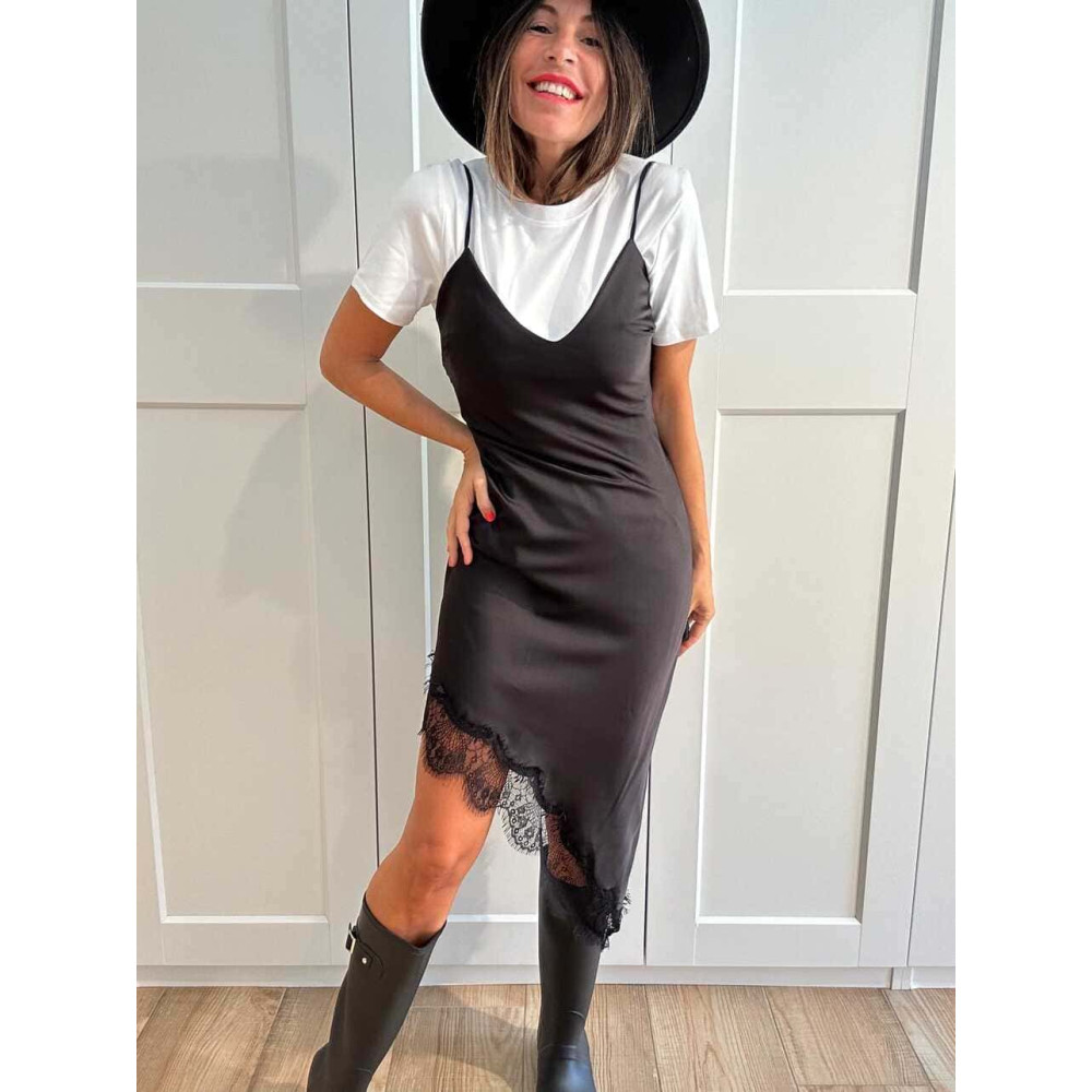 - Vestido corto de estilo lencero con bajo asimétrico y puntilla de encaje.