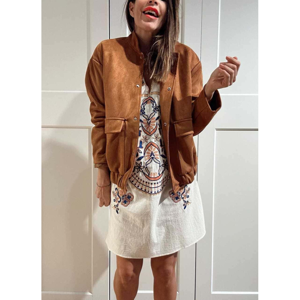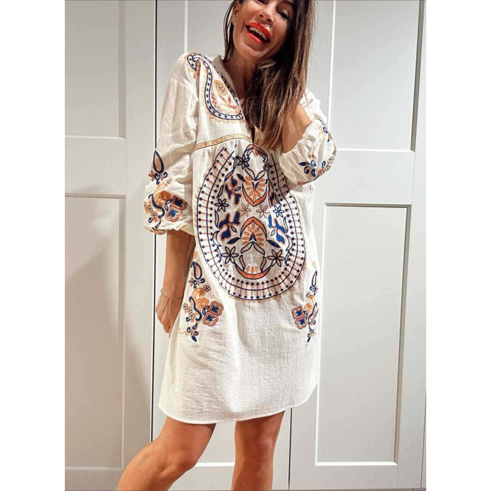 - Vestido corto estilo caftán con bordados de inspiración étnica en delantero y mangas.