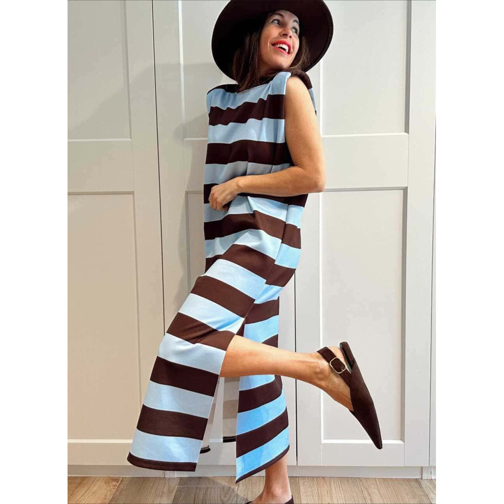 - Diseño con estampado de rayas anchas en combinación azul celeste y marrón chocolate.
