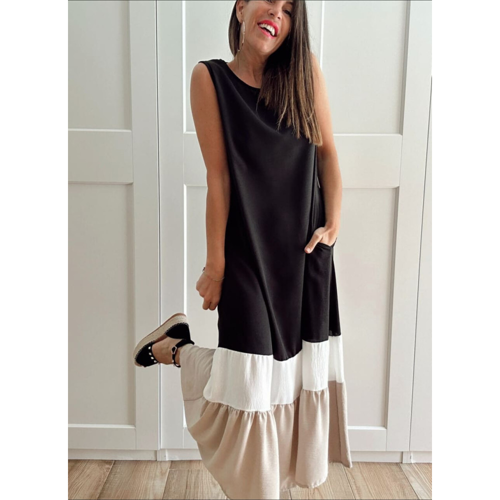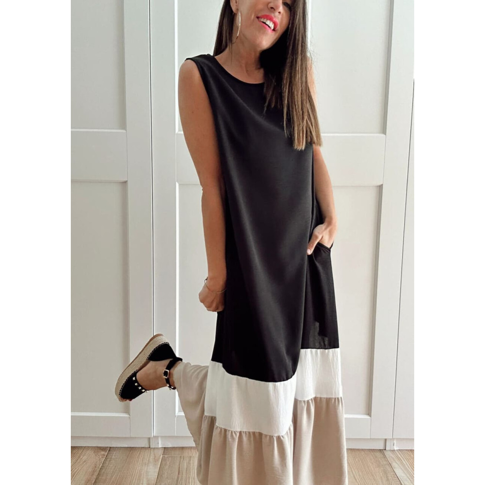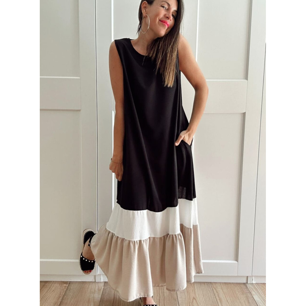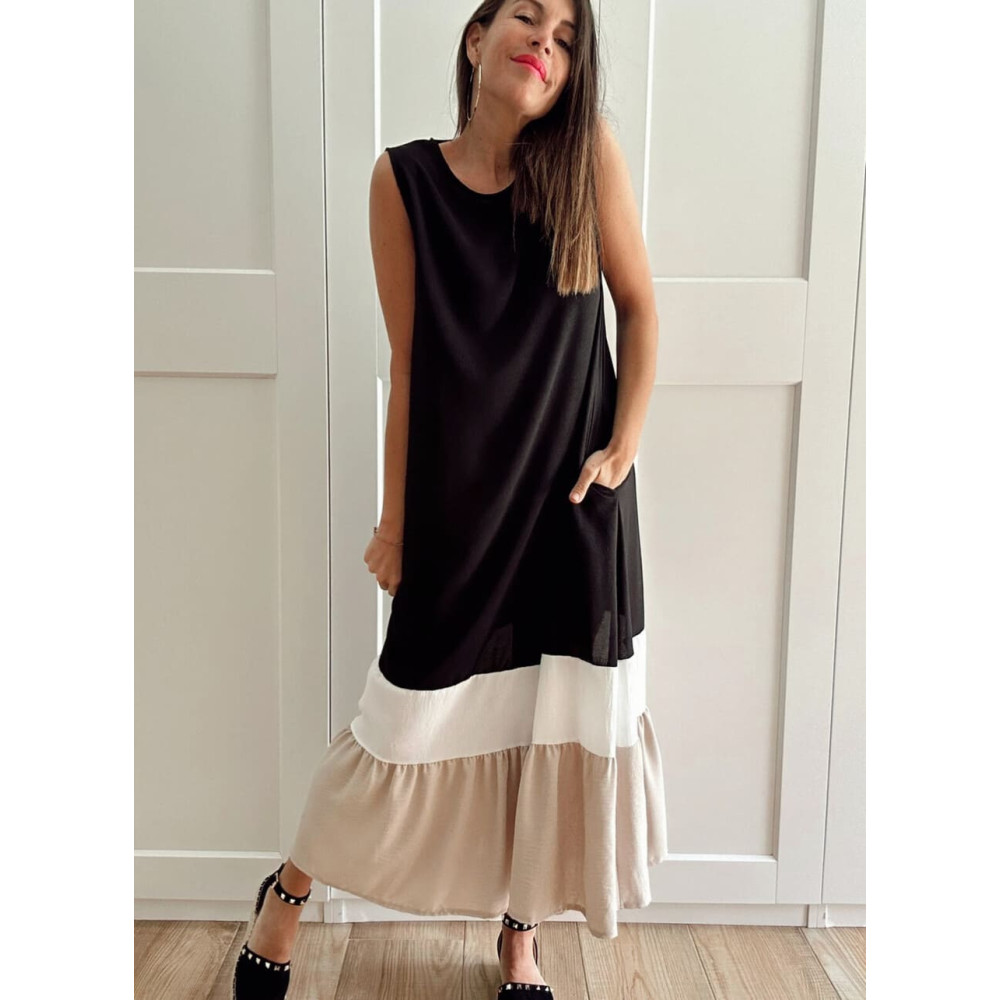 - Vestido largo con paneles color block en tonos negro, blanco y beige.