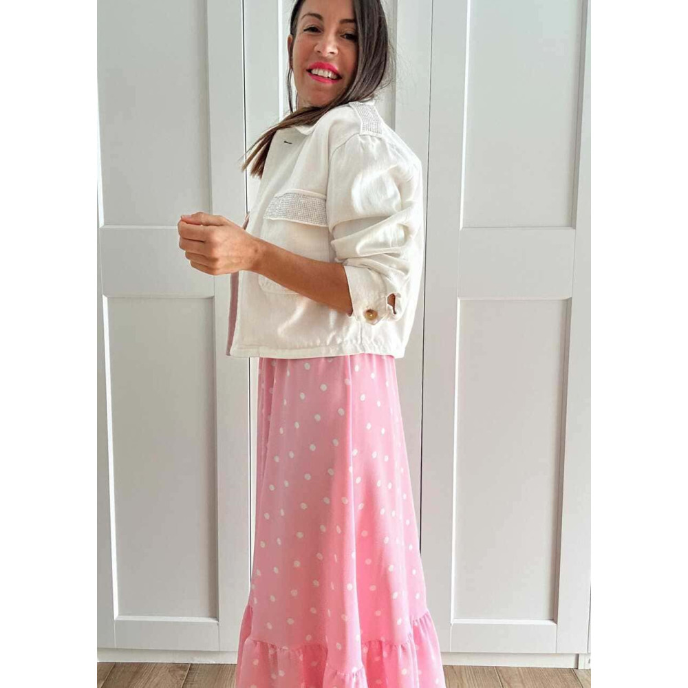 - Tela fina y fluida con estampado lunares en combinación rosa pastel y blanco.