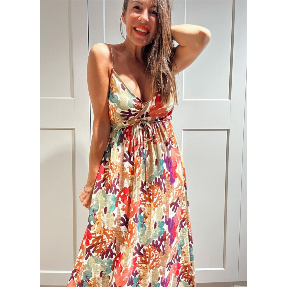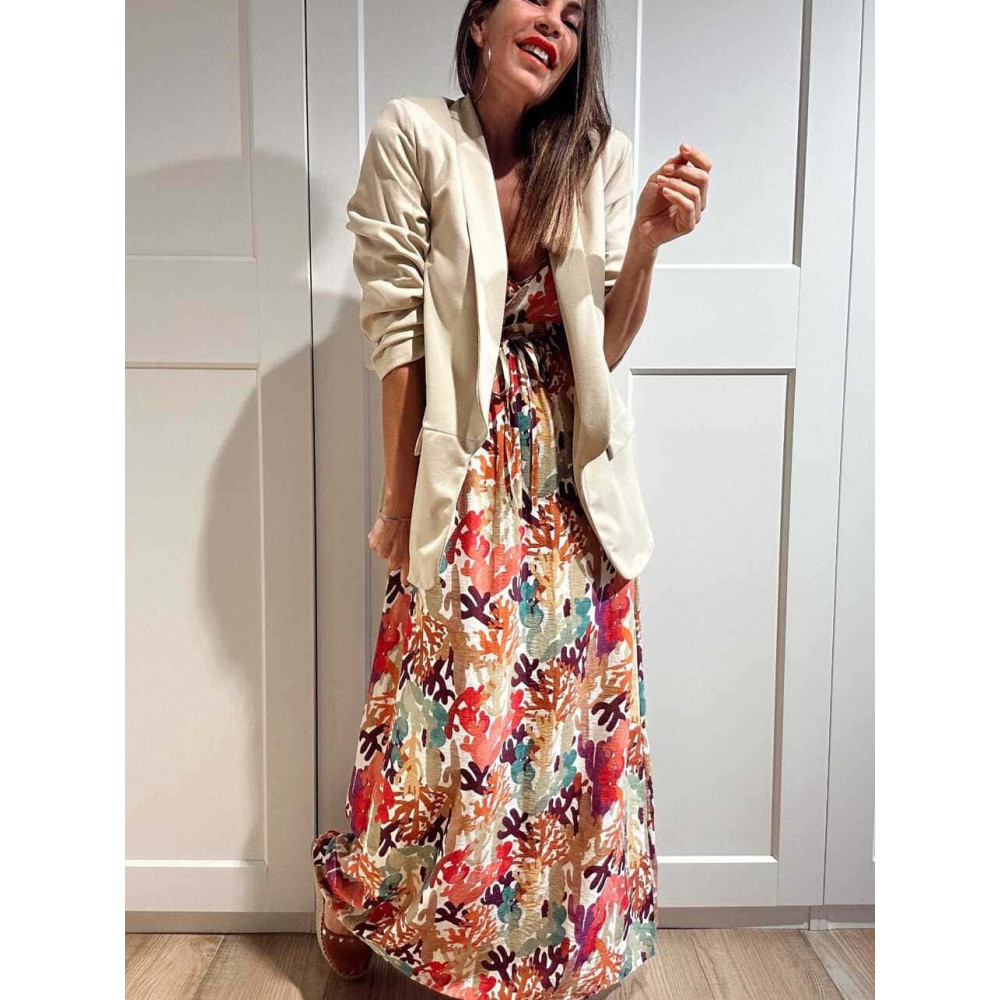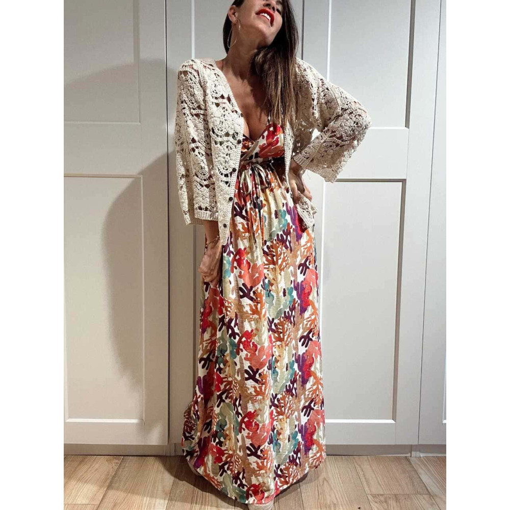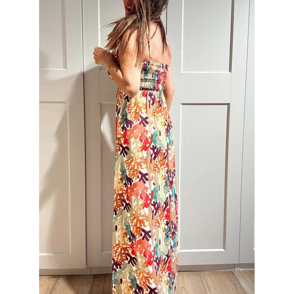 - Vestido largo con tirante fino regulable y panel elástico nido de abeja en la espalda.